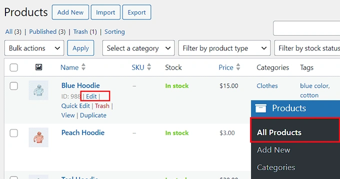 现在,您必须访问 WordPress 仪表板上的 "产品" 》" 所有产品 "页面,配置单个产品的库存数量。 为此,请单击任何产品下的 "编辑 "链接。