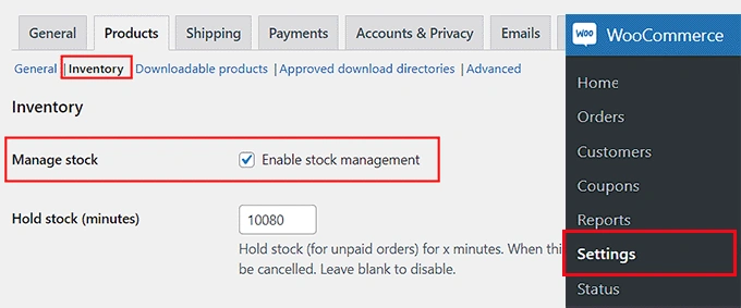 然后点击 "库存 "链接。这将在您的页面上打开一些新的设置,您必须勾选 "启用库存管理 "选项。