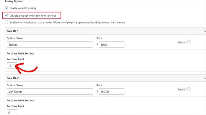 如果您为数字产品添加了多个价格选项,那么您还可以为不同套餐设置不同的购买限额。