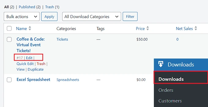 然后,从管理仪表板进入 Downloads 菜单选项卡。在这里,您将看到为网站创建的所有数字产品的列表。 点击编辑。