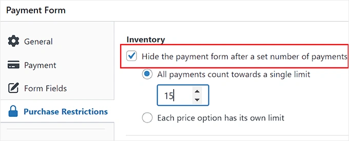 接下来,切换到 "购买限制 "选项卡,选中 "在设定的付款次数后隐藏付款表单 "选项。 勾选后,输入你想在表单中销售的订购数量。