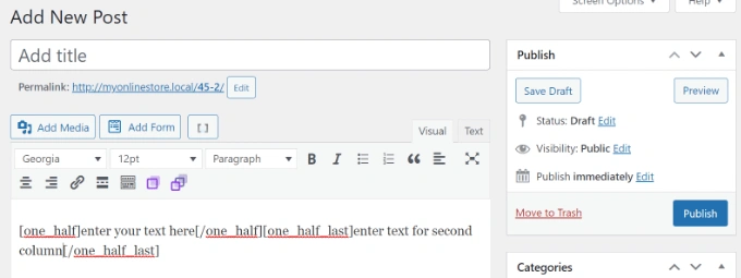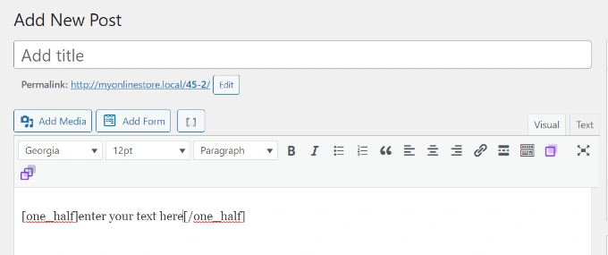 一旦你选择了一个短代码,它将自动出现在经典编辑器中。例如,我们为这个教程选择了one half的短码。