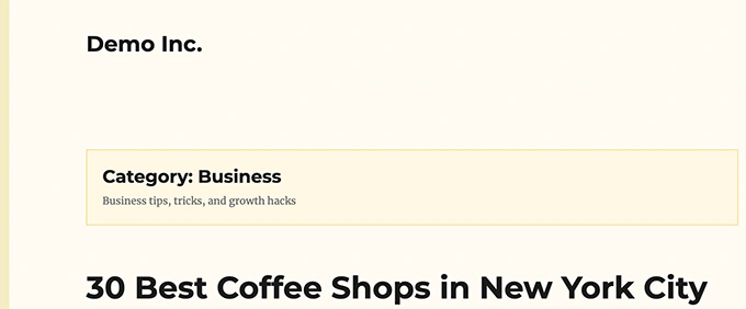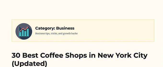根据您的主题,您可能还需要设置分类标题和描述等周围元素的样式。 我们简单地将分类归档标题和描述包装在 <div> 元素中,并添加了一个自定义 CSS 类。然后我们使用下面的 CSS 代码来调整标题和描述。