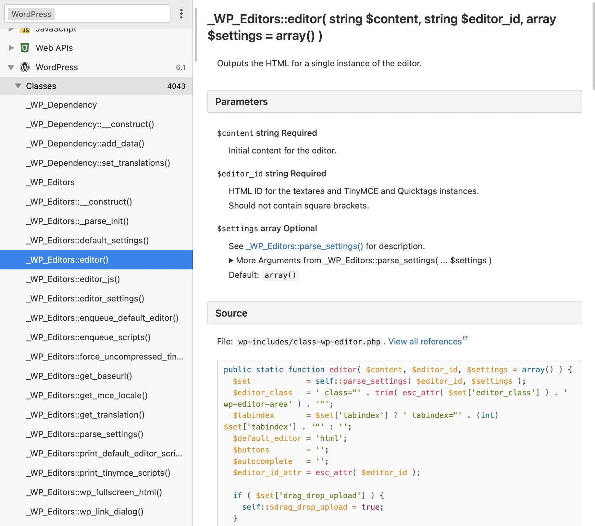 Devdocs.io是一个关于编程语言和Web开发工具的大量文档库。对于WordPress,文章专注于特定的编码元素,如钩子和类,并提供有用的信息,如如何使用代码,何时使用它,以及实践中的示例。