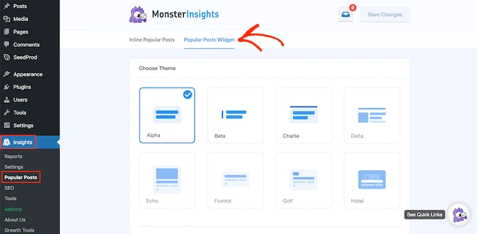 要查看不同的主题,请转到WordPress 仪表板中的Insights » Popular Posts,然后单击“Popular Posts Widget”。