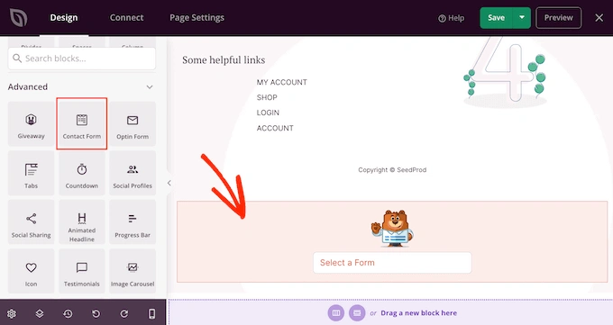 创建联系表单后,可以轻松将该表单添加到 404 页面。只需找到“联系表格”块并将其拖到您的设计中。