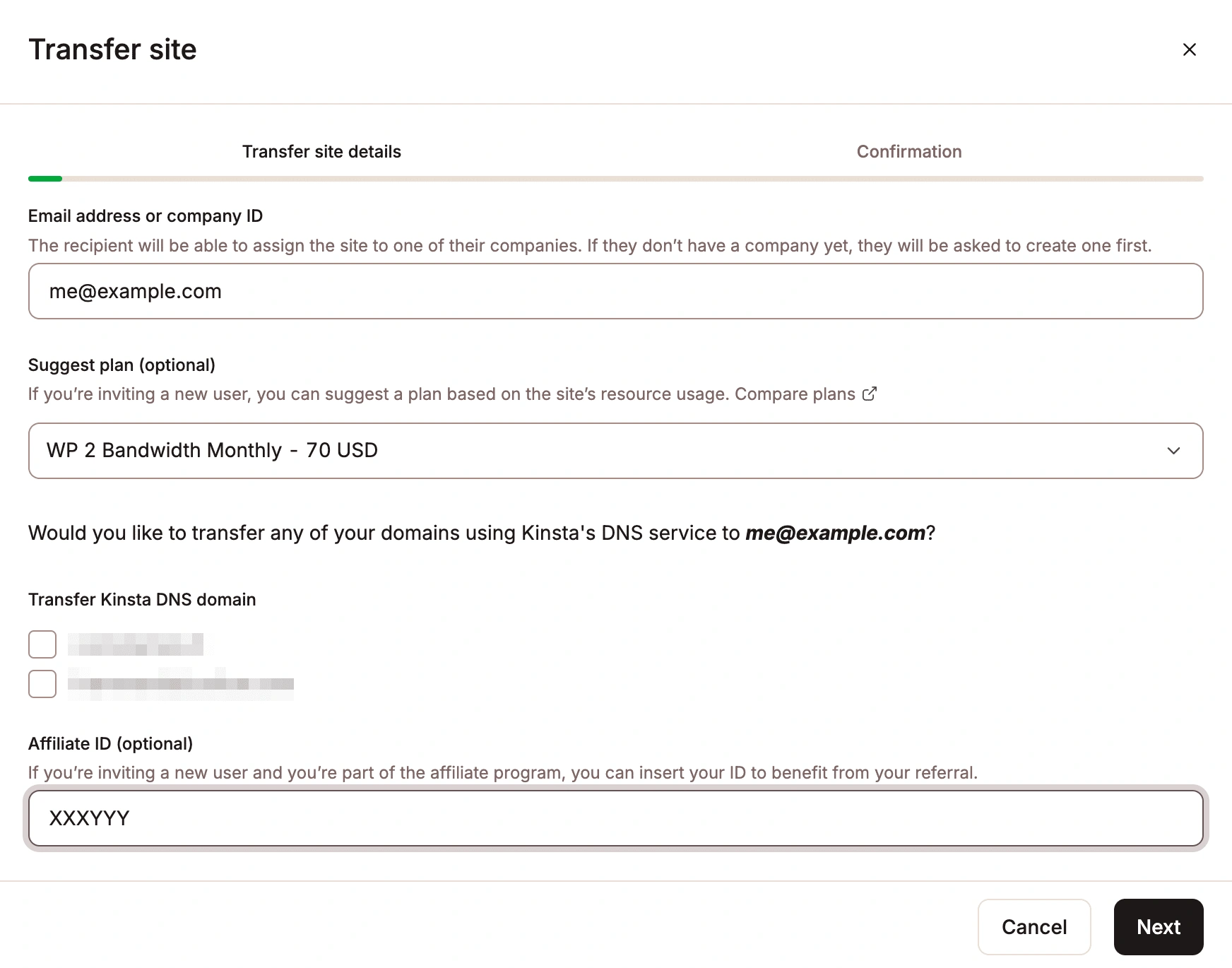 或者,您可以在 MyKinsta 的公司账户中为您的客户创建网站,然后通过网站转移工具将新网站的所有权转移给他人,并确保在转移表格中包含您的联属营销 ID。