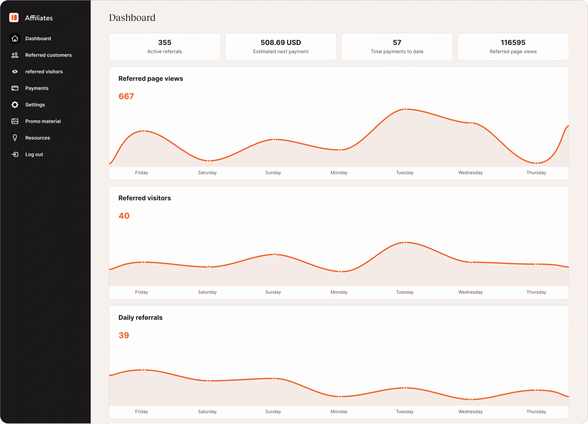 一旦您开始推荐客户,您将能够通过联属营销仪表板查看您的推荐和付款概览。