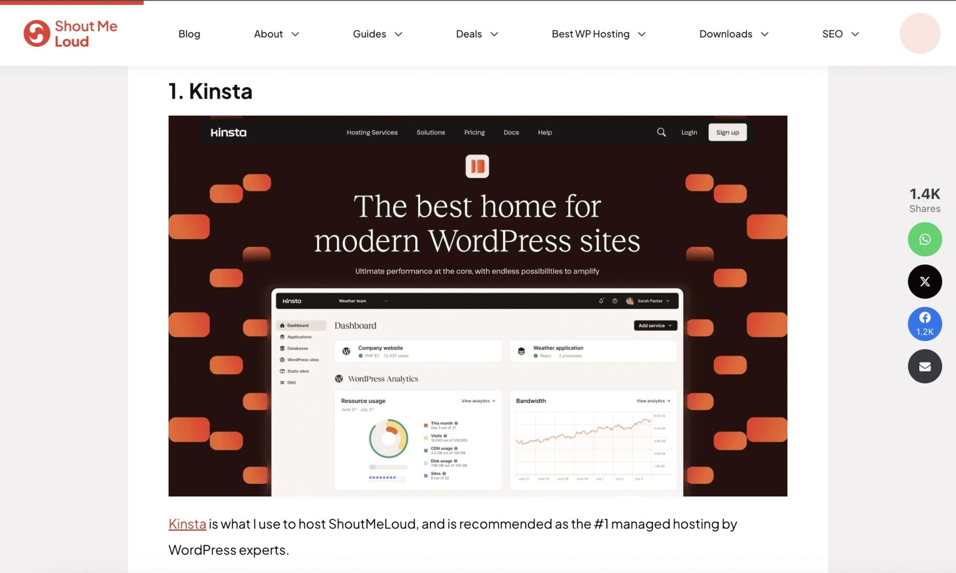 ShoutMeLoud 推荐 Kinsta 作为排名第一的 WordPress 托管服务(图片来源:Shoutmeloud