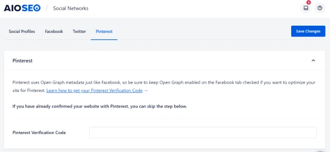 你可以点击屏幕上的链接,要求你的网站并获得确认码。更多细节,你可以看看我们关于如何在Pinterest上确认你的WordPress网站的指南。