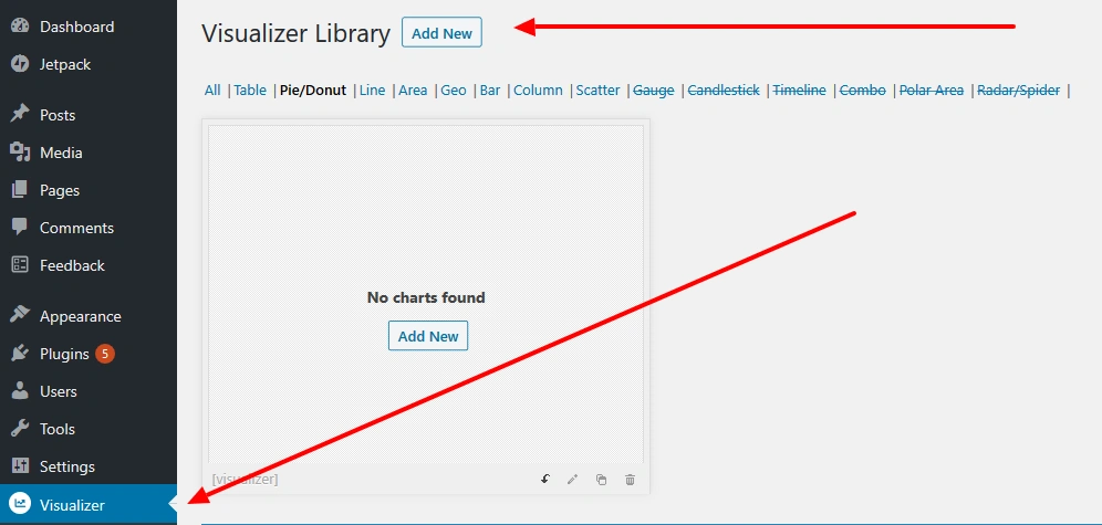 这没什么难的!你可以直接从WordPress仪表板像安装其他任何插件一样轻松获取并安装它。只需进入插件 ->> 添加新插件,然后在搜索字段中输入"Visualizer Charts and Graphs"即可。