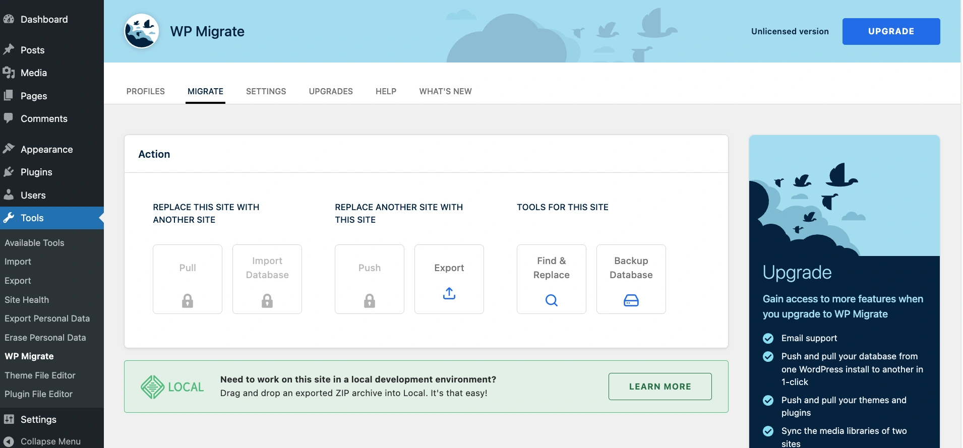 首先,确保WP Migrate Lite插件已安装并在旧域名上运行的WordPress安装中激活。您可以在WordPress管理侧边栏中导航到工具 -> WP Migrate找到它。