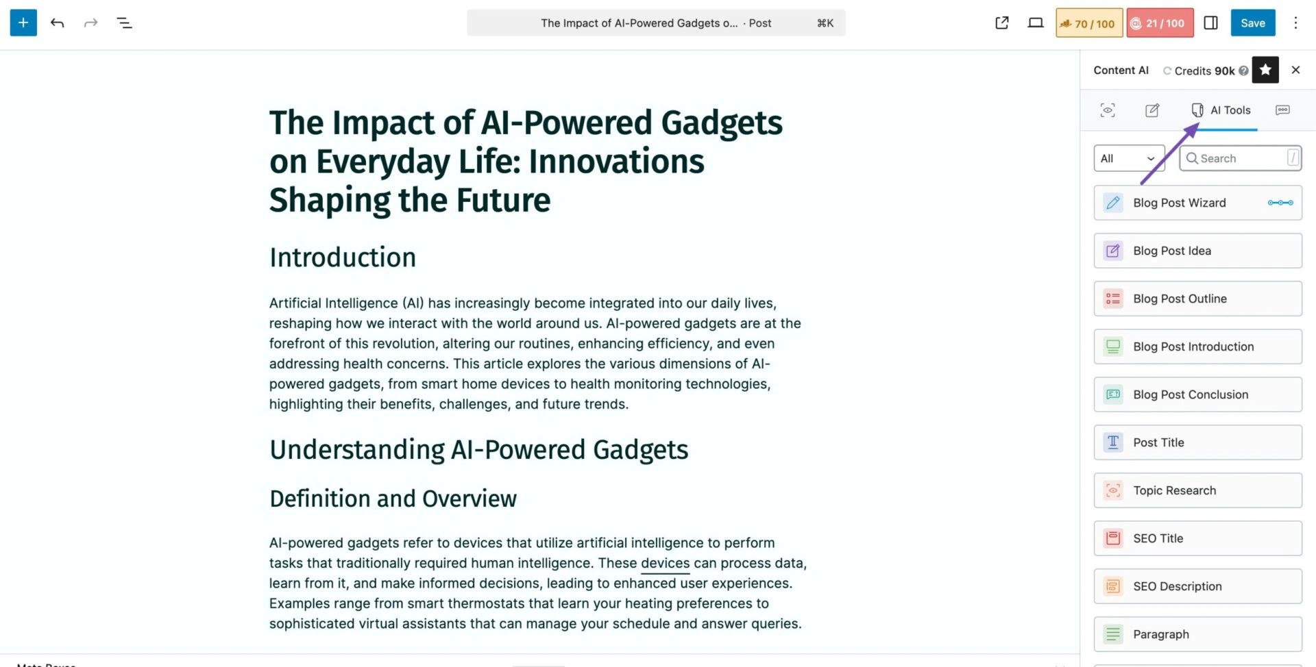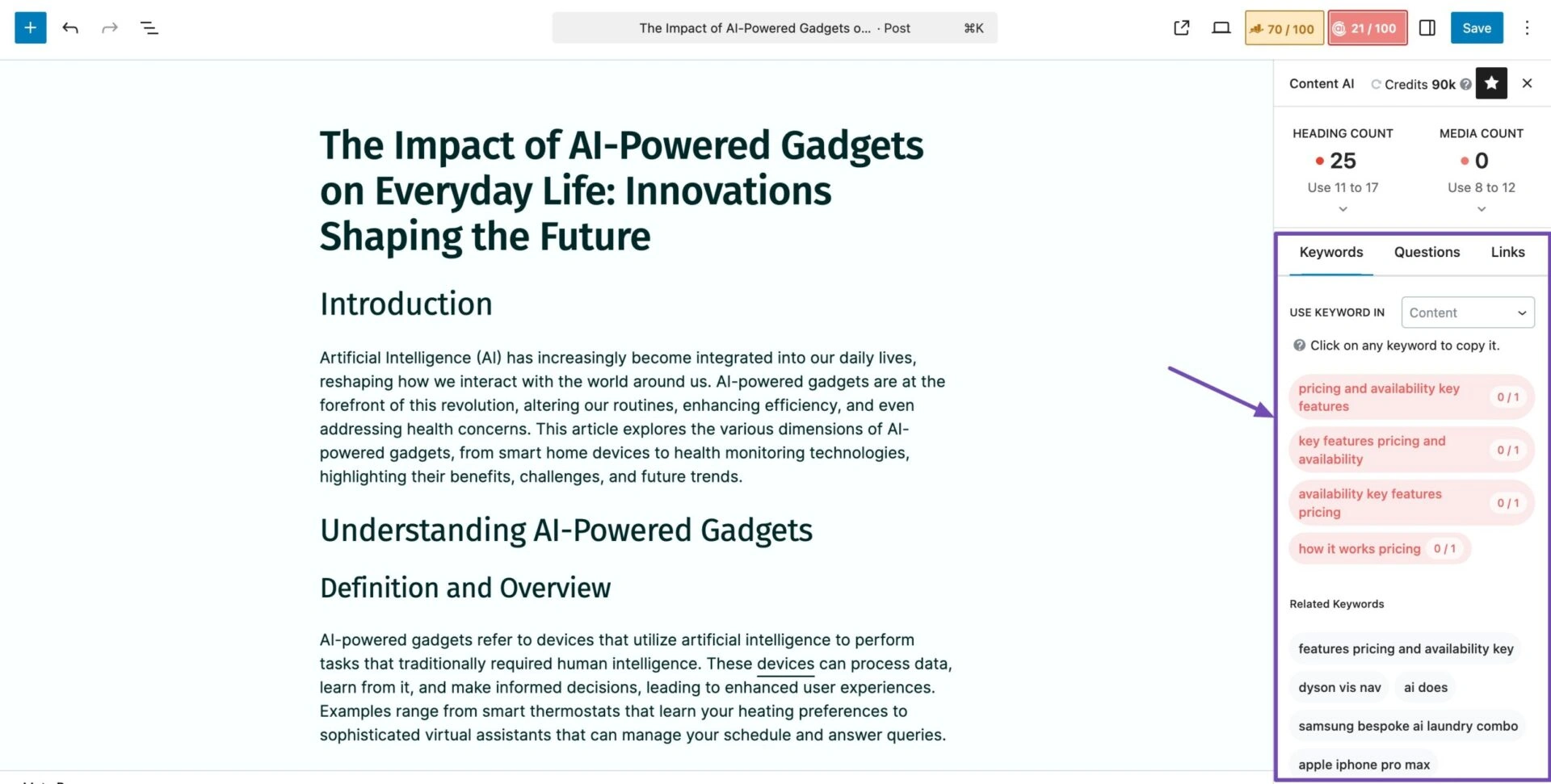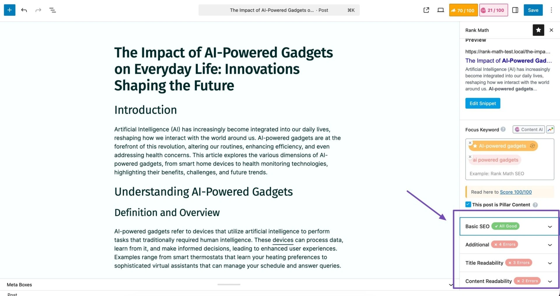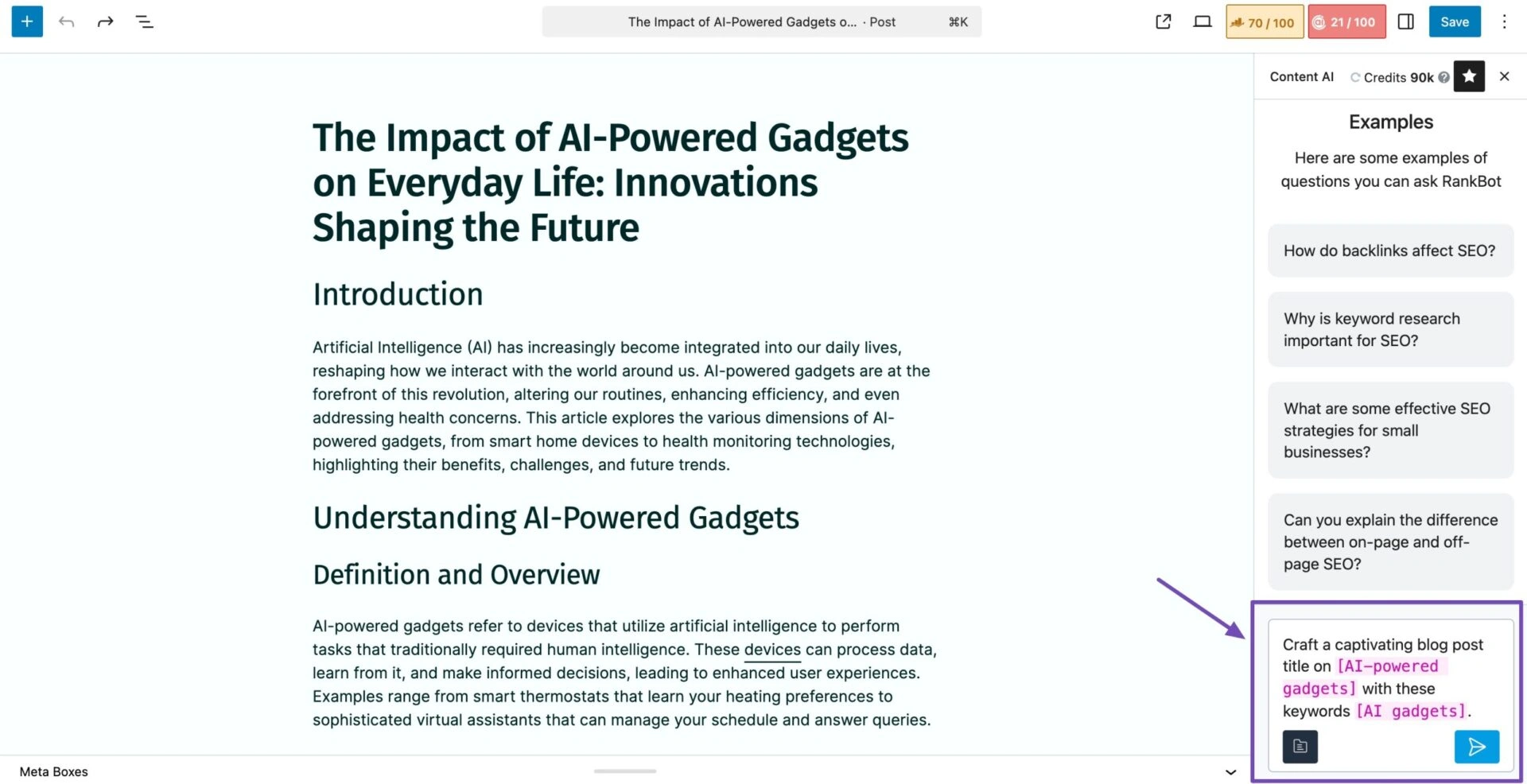 Rank Math Content AI 在您的WordPress编辑器中运行,帮助您在写作时改进内容。