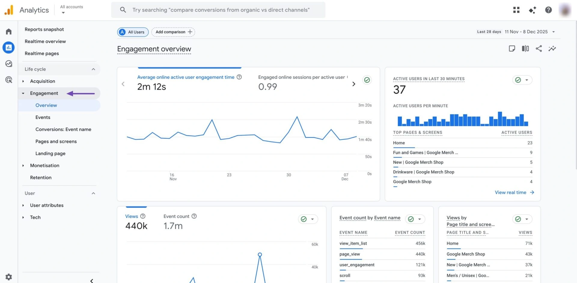 最有用的追踪指标之一是参与度。为此,请从分析仪表板导航到参与度 → 概览。您可以看到访客在页面上停留多长时间、滚动多远,以及是否与页面上的任何内容进行互动。