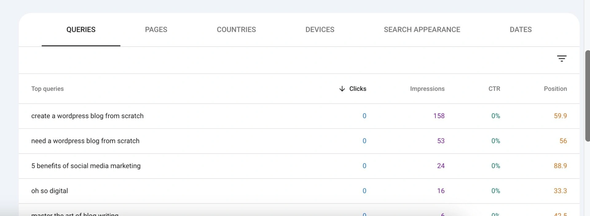 如果您注意到有些关键词有展示但点击很少,可能意味着您的标题或描述需要改进,或者您的内容没有完全回答搜索意图。