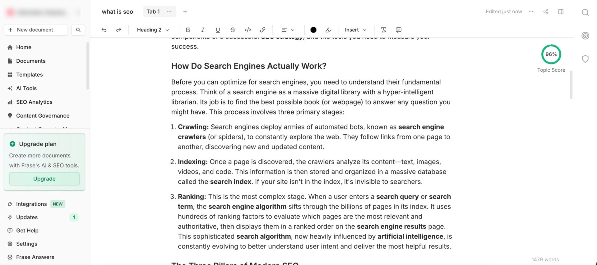 当你使用 Frase 时,你会获得一个一体化内容分析工具,它可以帮助你使用 AI 更快地研究、制定大纲和优化内容。它旨在减少你的手动研究时间,并为你提供清晰的、基于搜索引擎结果页面的见解,让你准确知道你的内容需要什么才能参与竞争。