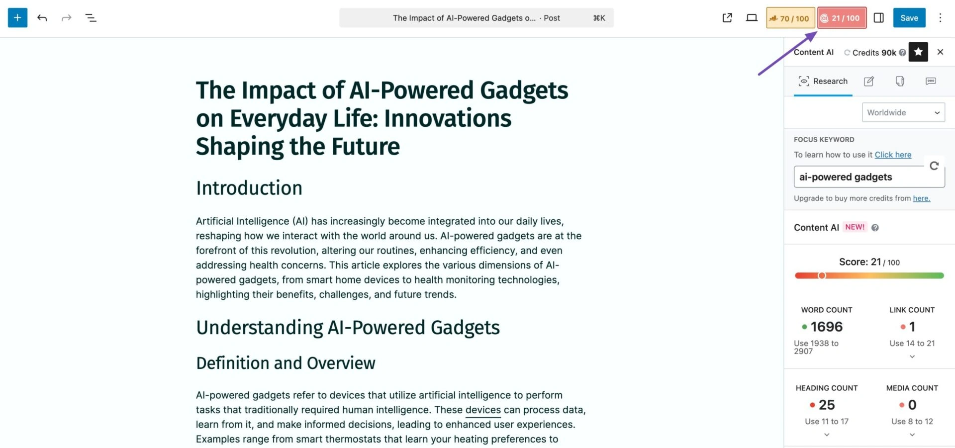 该工具为您提供内容分数,显示您的页面有多完整和优化良好。当您进行更改时,分数会更新,因此您可以实时查看您的进度。
