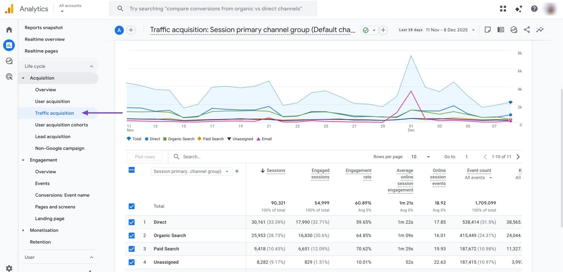 您还可以在流量获取报告中追踪流量来源,如下所示。
