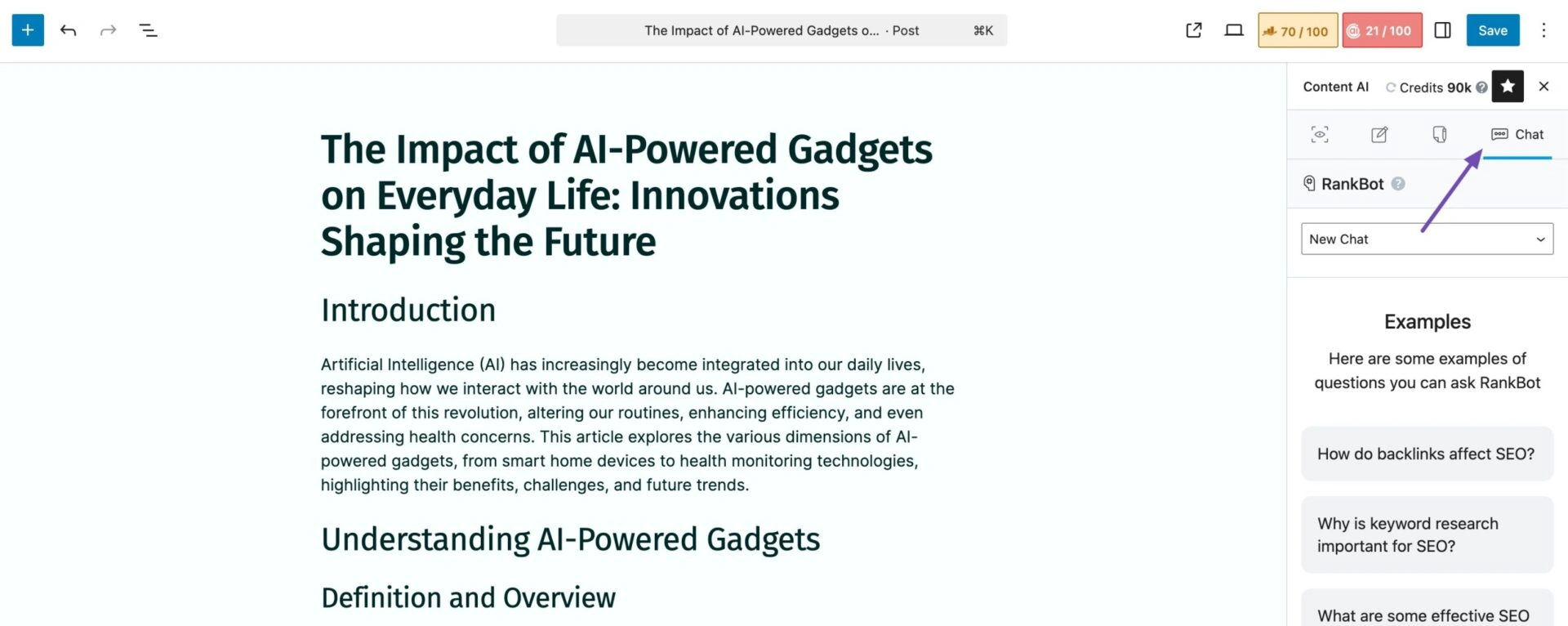 您还可以与RankBot开始对话,让它处理您的研究。导航到Content AI面板中的聊天选项卡。