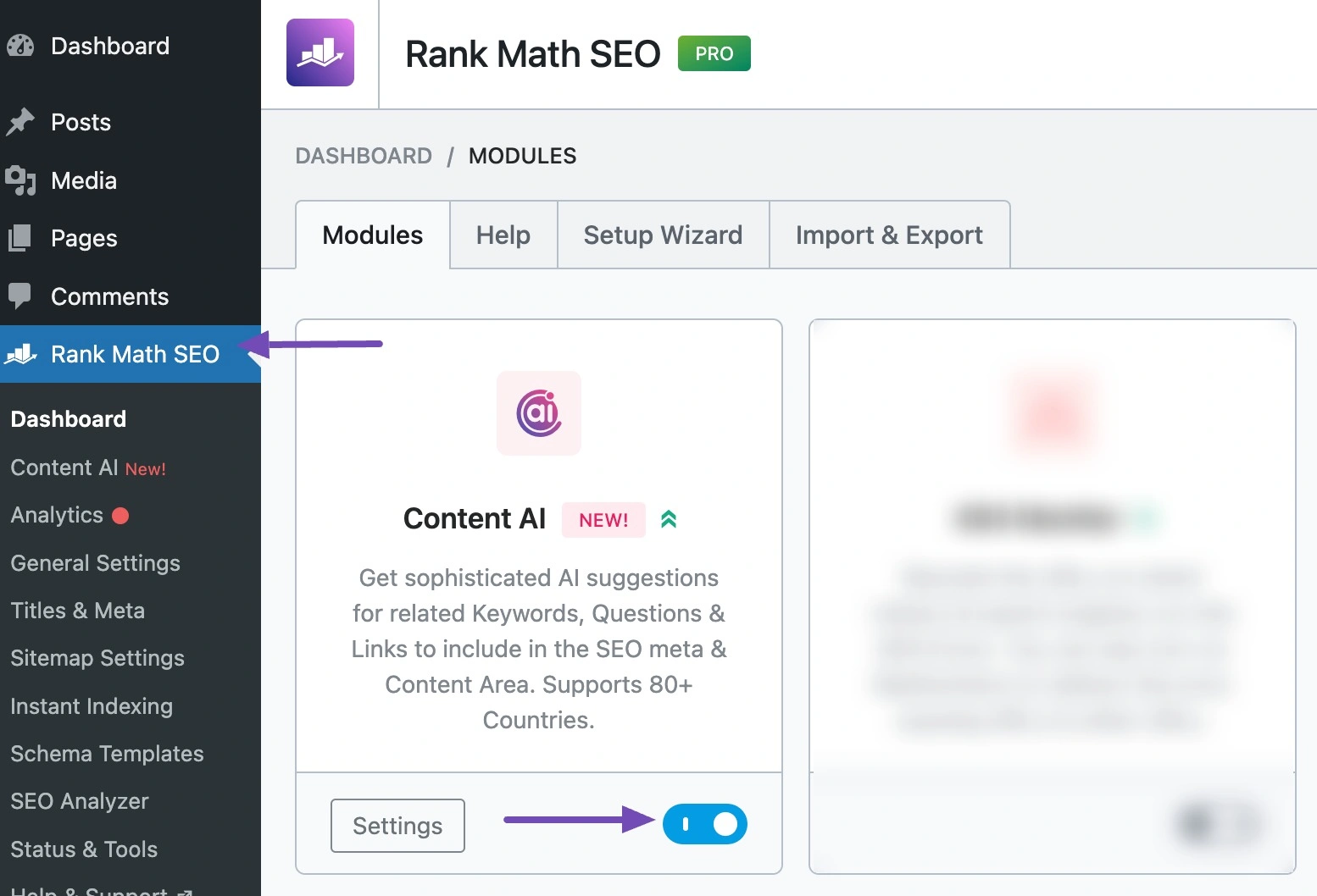 **注意:您必须从Rank Math仪表板启用Content AI**模块才能使用其功能。