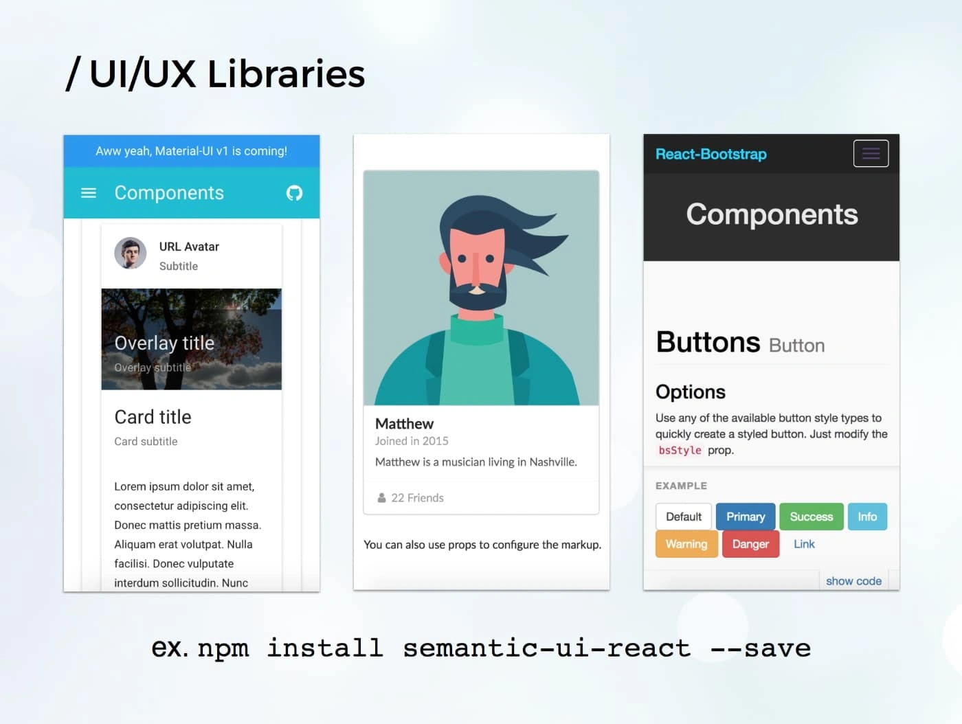 3) 小型组件: 保持组件文件较小可以使它们更容易测试和管理。您可以开始在一个组件中编写代码,一旦它变大,就将其分成较小的组件。对于 UI/UX 组件,有几个与 React 兼容的库,例如 Material UI、Semantic UI 甚至 Bootstrap,这里只是举几个例子。