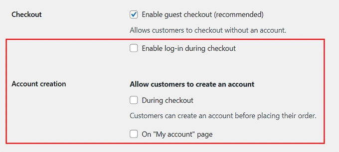 要启用此功能,请前往 WooCommerce » 设置» 账户与隐私 并勾选“允许客户创建账户”设置中的“结账期间”选项。