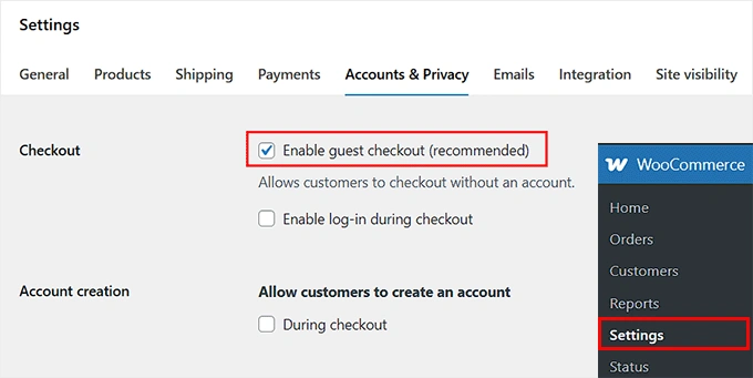 在这里,您会看到一个名为“启用游客结账(推荐)”的选项。