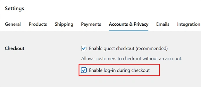 只需在 WooCommerce » 设置 »** 账户与隐私** 页面勾选"结账时启用登录"选项。这对之前在您这里购物过的顾客来说更方便。