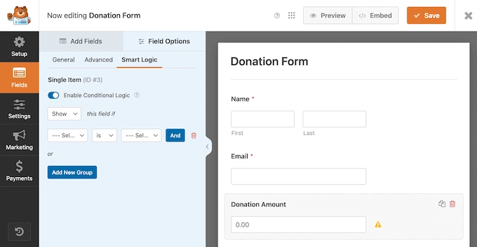 然而,真正的力量在于它的条件逻辑。就像 WPForms 一样,Formidable Forms 可以根据用户的答案显示或隐藏不同的问题。这种自定义交互级别确保你收集的数据比静态 GoFundMe 页面更好。