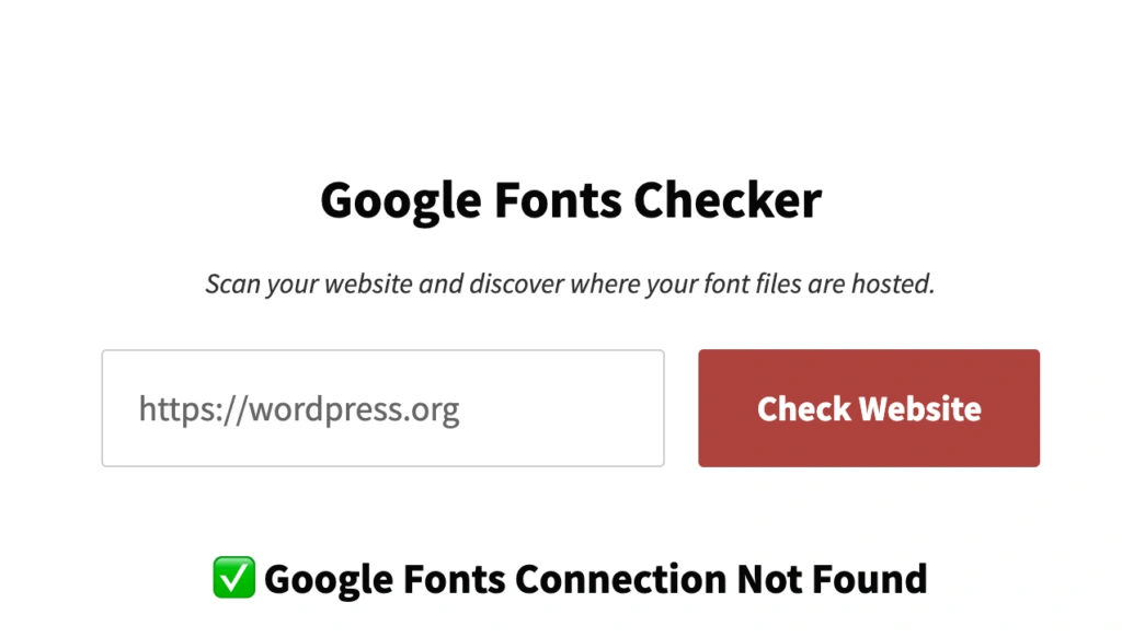 Fonts Plugin(WordPress.org上有免费版本的商业产品)的制造商已经创建了一个名为Google Fonts Checker的工具,将帮助网站所有者发现他们的字体托管在哪里。该工具分析任何输入的URL,如果字体是由谷歌托管的,它将显示 "发现谷歌字体连接",并有一个红色的'X'。清晰的网站将显示一个通知,即没有发现谷歌字体连接。