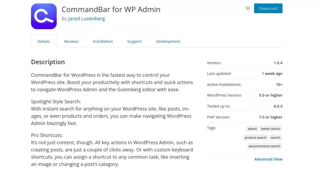 首先,从WordPress.org页面直接下载CommandBar插件。