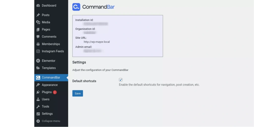 在你的WordPress管理仪表板的左侧菜单中,你会看到一个名为CommandBar的新项目。点击它,你会看到一个简单的屏幕,显示你的网站信息和一个设置复选框。