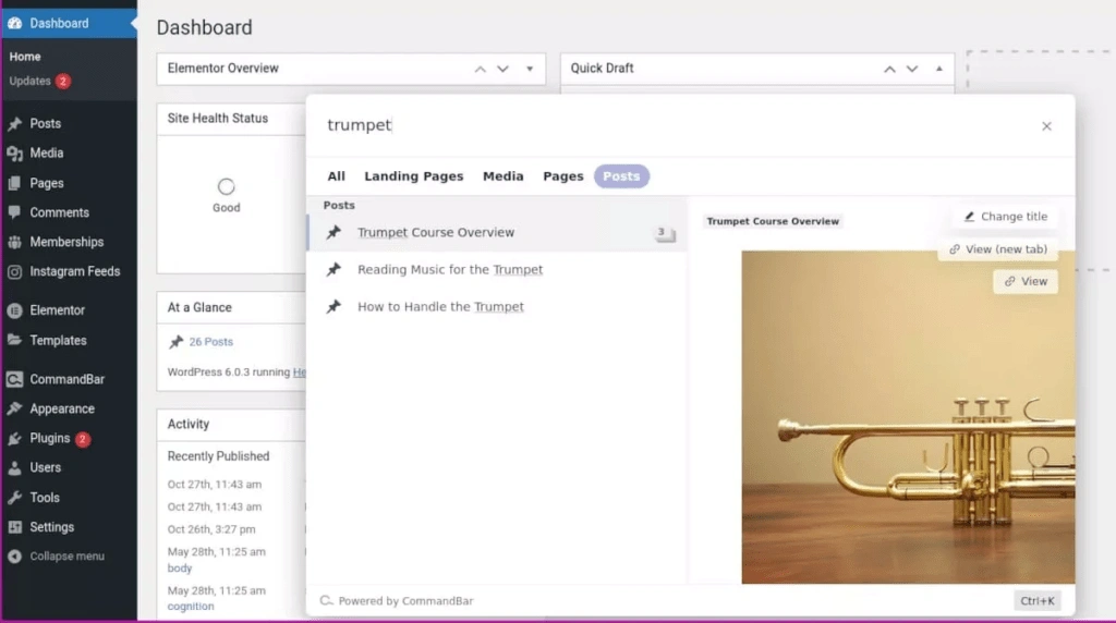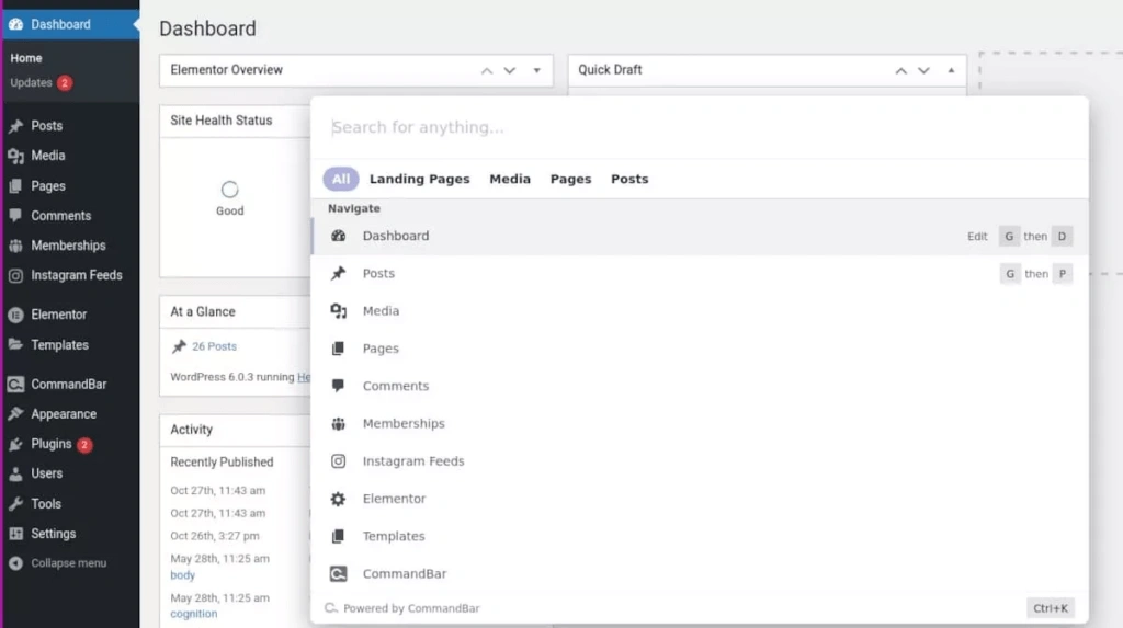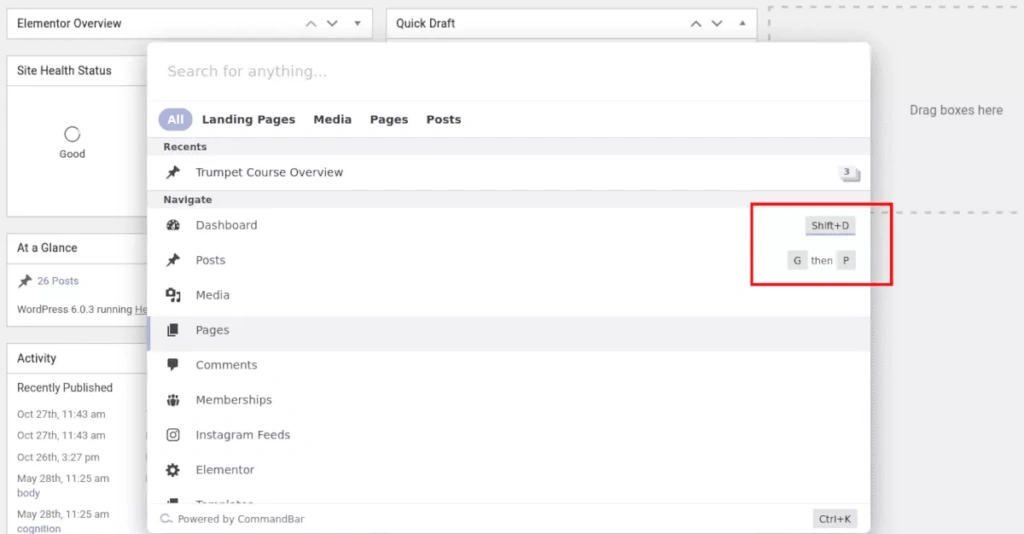 命令栏的搜索功能并不局限于你网站上的内容。你也可以从搜索窗口跳到任何WordPress管理区。选择列表中的任何项目并点击回车。你可以快速进入仪表板、帖子、媒体、页面、评论--甚至页面生成器模板。