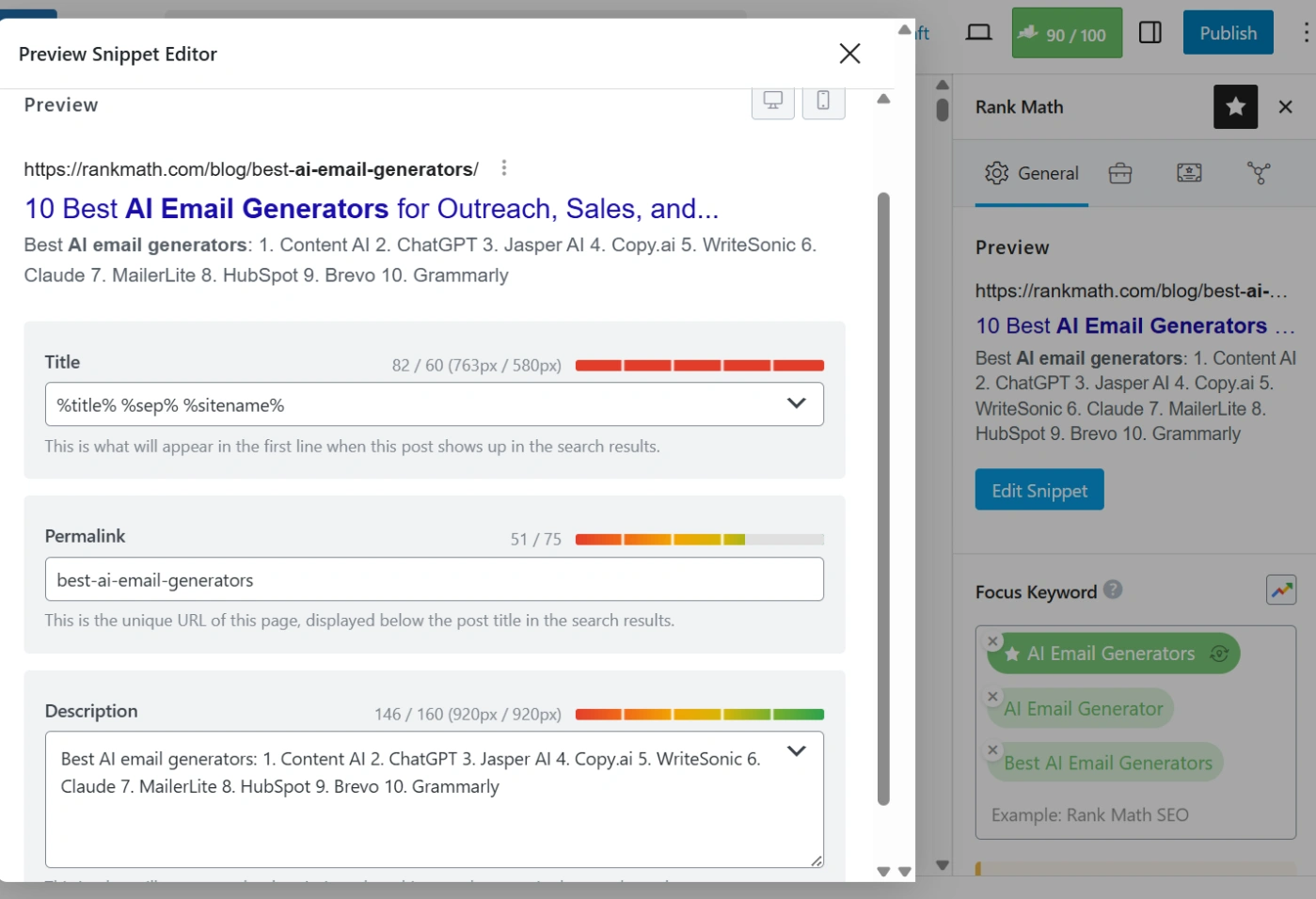 当您撰写或更新文章时,Rank Math 会为您的页面评分并给出直接的建议。