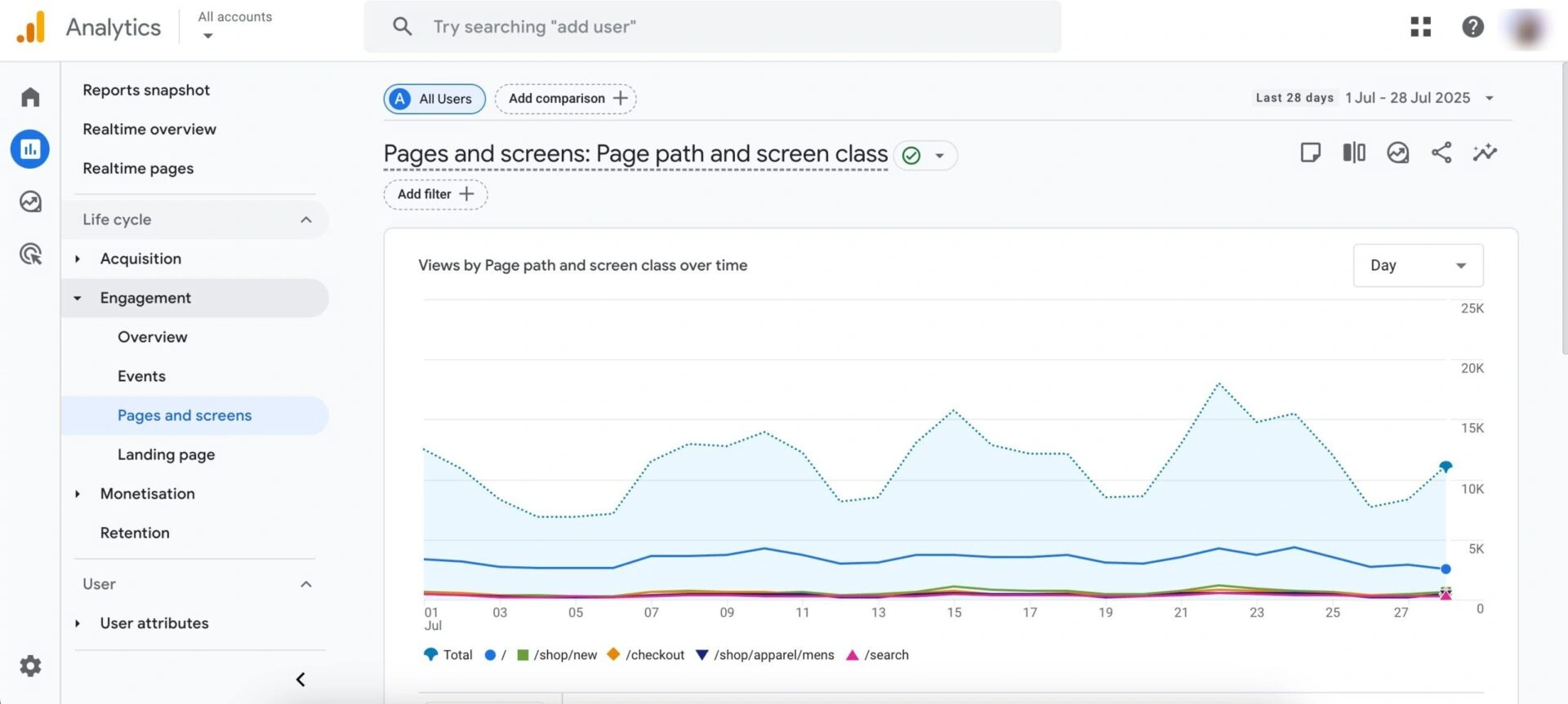 - 参与度洞察: GA4 向您展示用户停留多长时间,他们与哪些页面互动,以及在哪里流失。这帮助您改进有流量但不转化的页面。