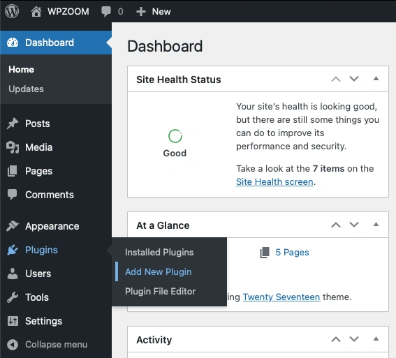 2.从 WordPress 仪表板,导航至左侧菜单中的插件 > 添加新插件。