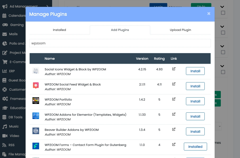 3.点击要添加新插件的网站的 "Manage Plugins"。此时会出现已安装插件的列表。