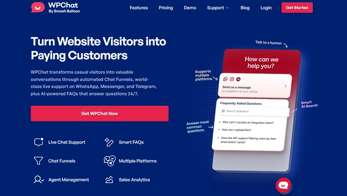 总体而言,WPChat 是大多数用户的最佳 WhatsApp 插件。它结合了多平台支持和 AI 自动化功能,让您无需组建大型客服团队即可高效处理客户对话。