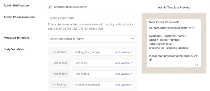 可视化编辑器让我可以填写管理员电话号码字段,分配消息模板,并使用内置变量插入动态订单详情。我可以通过简单的下拉菜单完成所有这些操作,无需编写代码。
