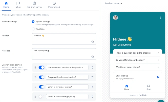 然后我使用 Tidio 的可视化编辑器来微调聊天。我设置了对话开场白来回答关于产品、折扣和运输的常见问题,然后在需要时将访问者引导至实时代理。