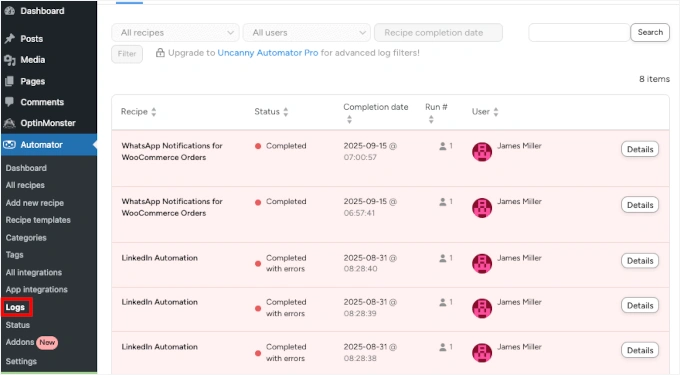 然后,您可以在"日志"选项卡中监控所有自动化活动,在那里您可以看到配方何时运行以及是否成功或失败。