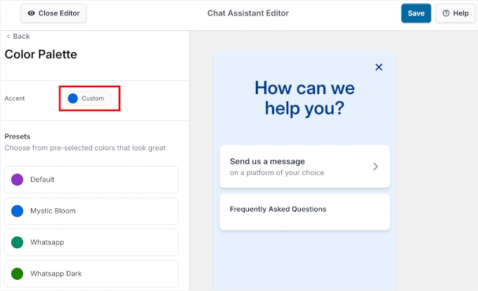 可自定义的小组件让我完全控制外观。我可以轻松调整调色板,选择与我的品牌匹配的聊天图标,并选择助手头像。