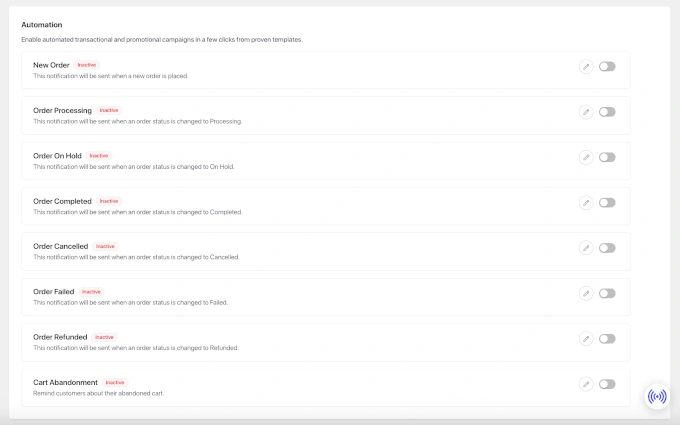 连接后,我启用了PushEngage为WooCommerce订单状态预建的WhatsApp通知工作流,包括新订单、处理中、已完成、已取消和退款。