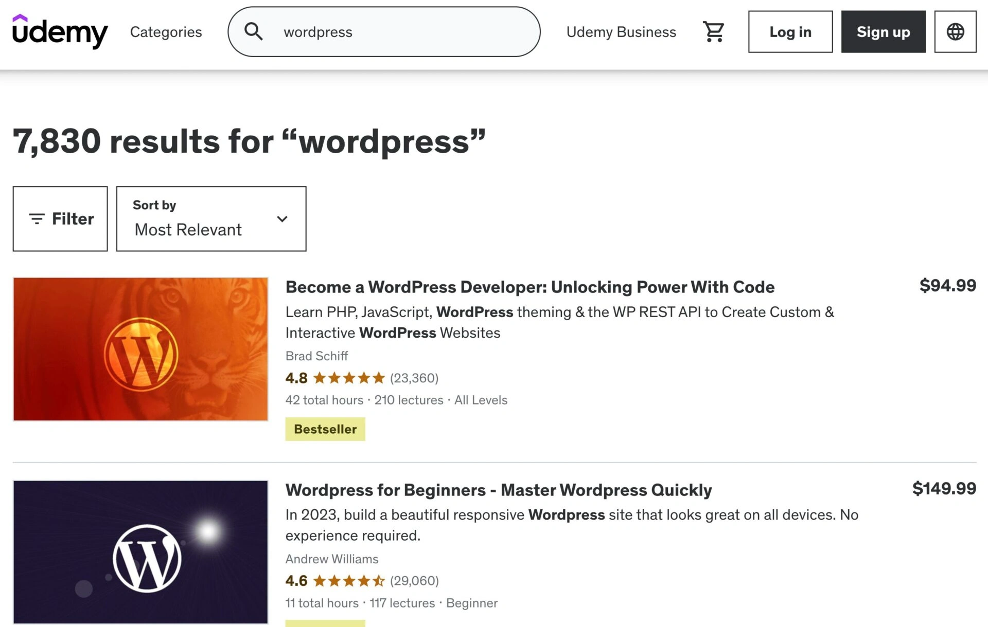 虽然 Udemy 并不专门针对 WordPress 培训,但它也是寻找课程的另一个绝佳场所。只需使用关键词搜索这个教育平台的庞大目录,您就会找到超过 7,000 门与该 CMS 相关的课程。