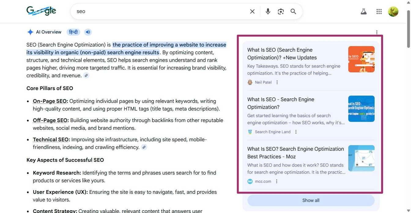 除了这些方法,我还喜欢使用Google的AI概览和AI模式作为快速的研究层。当我搜索我的主要主题时,我会密切关注AI引用的来源,因为它们经常会呈现人们正在积极寻找的广泛问题。结构化的要点和高亮的术语通常反映了用户最关心的答案和子主题。如果我想深入了解,我会点击“显示更多”,这会揭示我最初可能没有考虑到的其他角度和后续问题。
