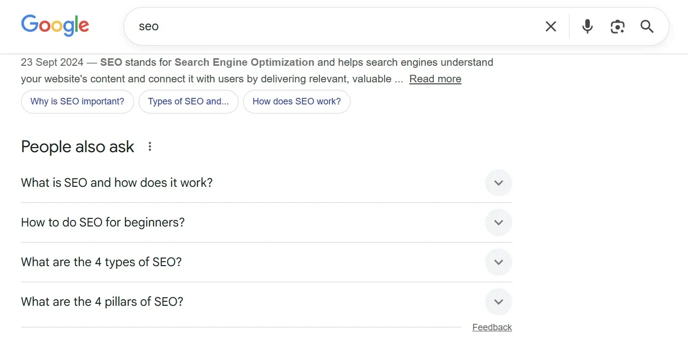"其他人还在问"部分显示与广泛关键短语"SEO"相关的问题
