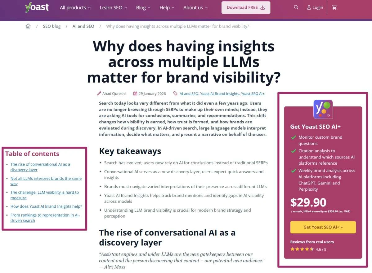 Yoast 博客文章中用作互动点的目录和侧边栏 CTA 示例