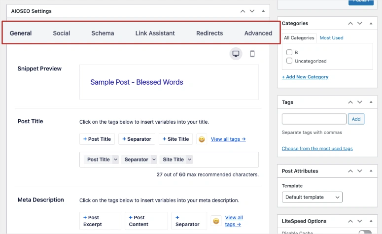 当您在网站上安装了AIOSEO,您会看到AIOSEO设置框出现在帖子编辑界面内。这让你可以为你创建的每一个帖子轻松地设置帖子的标题和元描述。