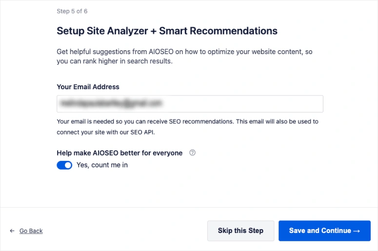 我们建议保留网站地图的功能。这将为谷歌搜索机器人创建一个地图,以方便抓取你的网站和索引你的内容。之后,你需要输入你的电子邮件地址。这将用于将您的网站连接到插件的SEO API。