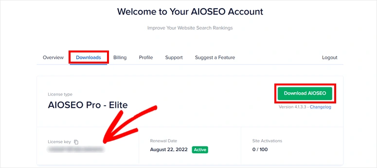 如果你已经购买了高级版本,在你的All in One SEO账户内,你会看到一个 "下载 "标签。在这里,你可以下载高级AIOSEO插件并将其上传到你的WordPress网站。
